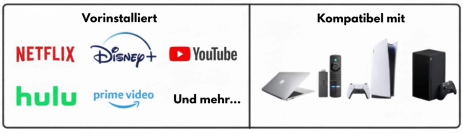 Kompatibel mit iPhone/Android, Laptops, Konsolen (Xbox, PS5 uvm., Fire TV/Chromecast u. v. m. Verbindung per WLAN/Screen-Mirroring (AirPlay/Miracast), HDMI, USB, AUX oder Bluetooth.